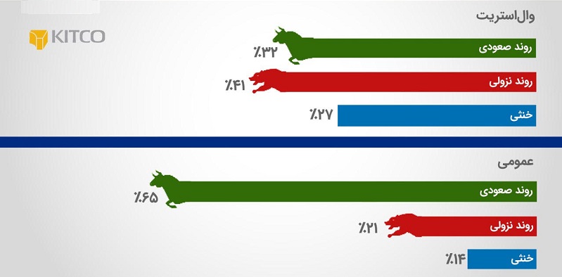 این هفته، 22 تحلیلگر وال استریت در نظرسنجی Kitco News Gold شرکت کردند. در میان شرکت کنندگان، هفت تحلیلگر، معادل 32 درصد، نسبت به طلا در کوتاه مدت خوشبین، 9 تحلیلگر، معادل 41 درصد، به این بازار بدبین و شش تحلیلگر، معادل 27 درصد، روند را بازار را کمنوسان ارزیابی کردند.